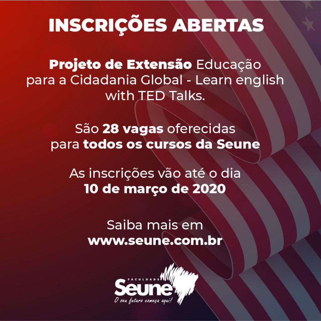 A Coordenação de Pesquisa e Extensão da SEUNE, no uso de suas atribuições regimentais e regulamentares, torna público que, no período de 13/02/2020 a 10/03/2020, encontram-se abertas as inscrições para a seleção dos candidatos ao Projeto de Extensão em Educação para a Cidadania Global – LETT da SEUNE para exercício nos semestres letivos de 2020.1 e 2020.2.